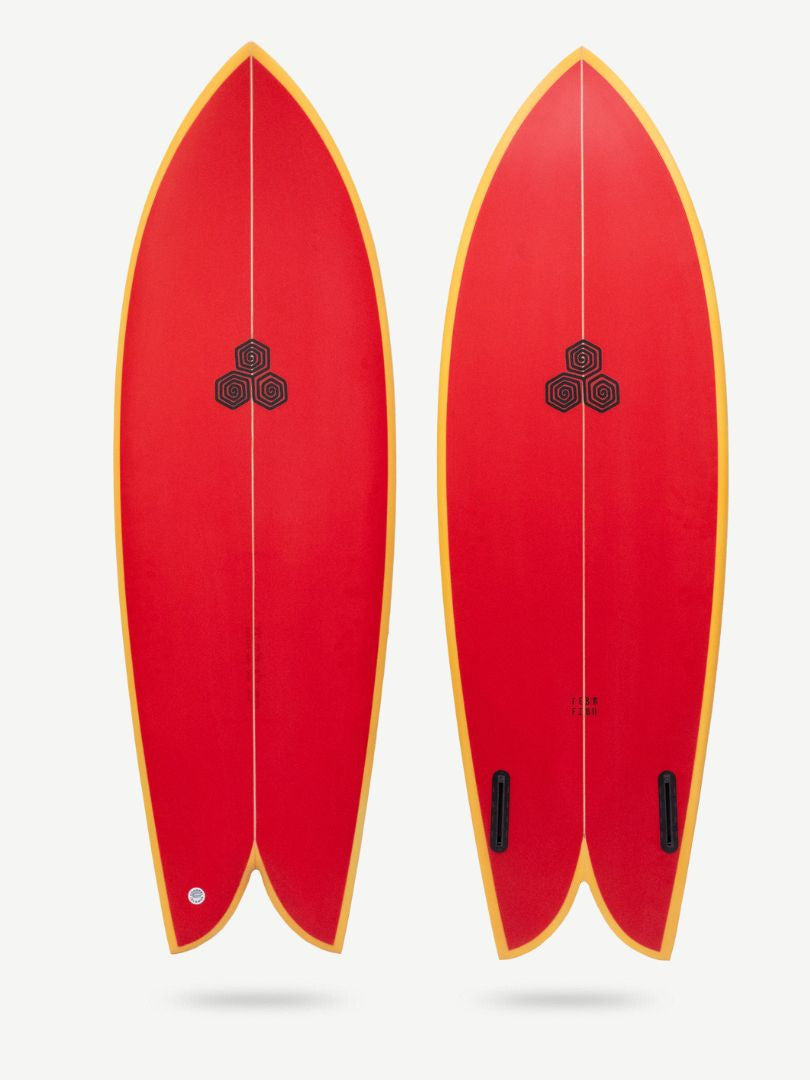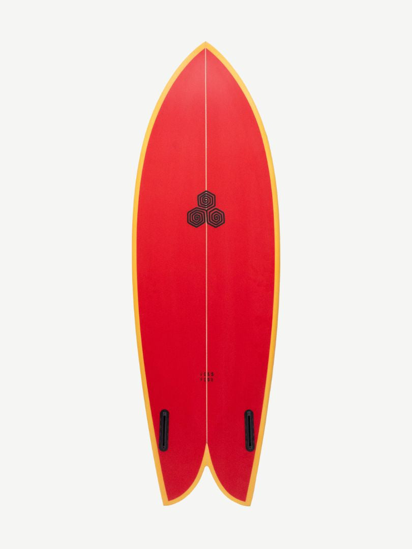 For sizing reference on the Feb's Fish, Mikey is 6'3, 75kgs and rides the 5'5 in stock dims.