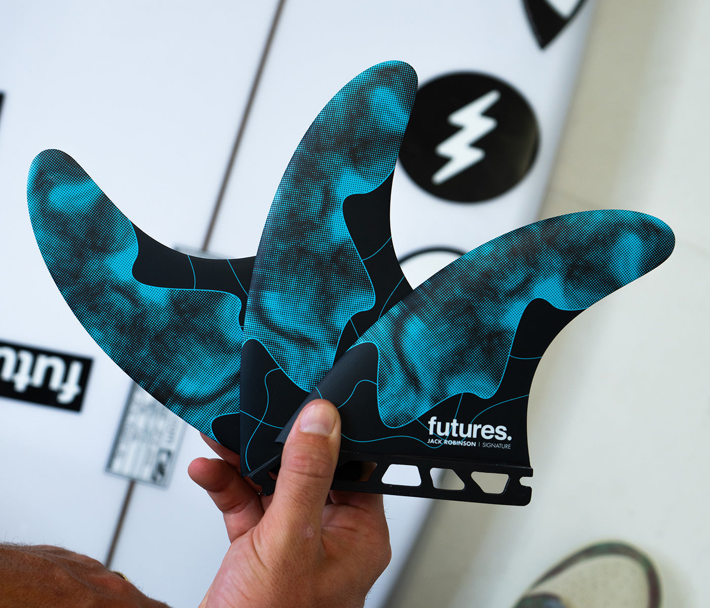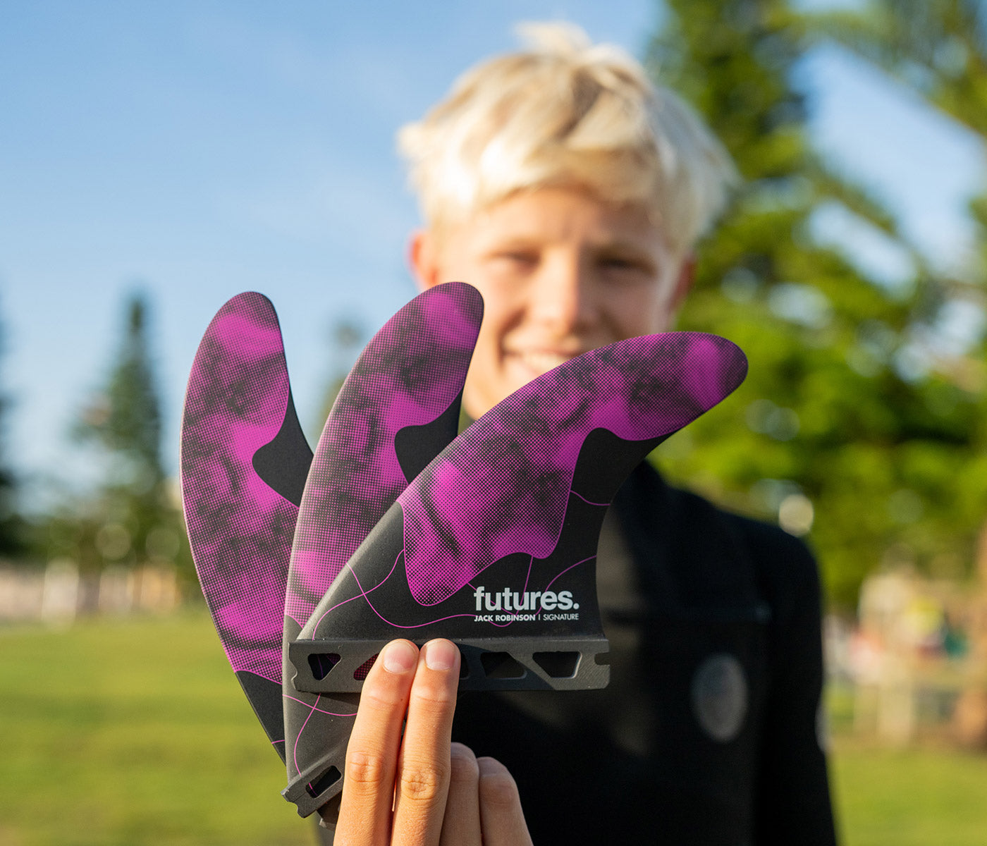 Jack Robinson's new signature thruster fin is a large size fin in the Rake template category. Developed to suit Jack's style of surfing above and below the lip, he has been putting it through the paces at some of the best waves in the world with incredible success. The centre fin is smaller than the side fins for increased manoeuvrability.